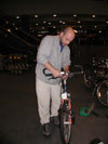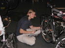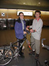 Benedikt die Fahrkarten und wir dekorieren mit unseren Radln die Fassade eines Cafés.